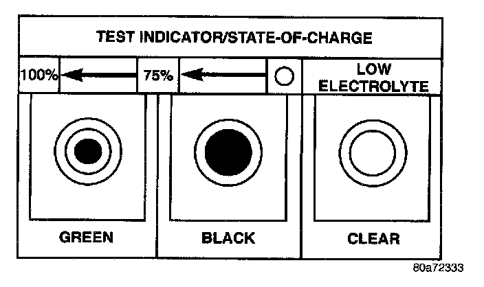 - Green - Indicates 75% to 100% battery state-of-charge. The battery is adequately charged for further testing or return to service. If the starter will not crank for a minimum of fifteen seconds with a fullycharged battery the battery must be load tested. Refer to Standard Procedures for the proper battery load test procedures.