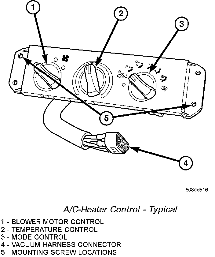 2. Position the A/C-heater control onto the instrument panel and install the retaining screws. Tighten the screws to 2.2 Nm (20 in. lbs.).