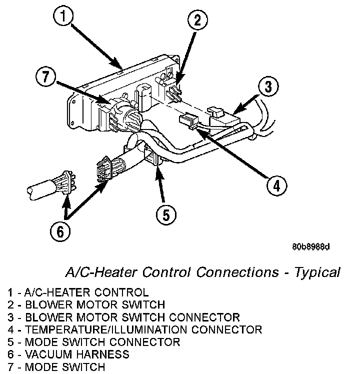 4. Reach through the instrument panel glove box opening to access and disconnect the two halves of the A/C-heater control vacuum harness connector .