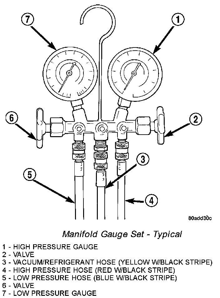 A manifold gauge set may be needed with some recovery/recycling/charging equipment. The service hoses on the gauge set being used should have manual (turn wheel), or automatic back-flow valves at the service port connector ends. This will prevent refrigerant from being released into the atmosphere.
