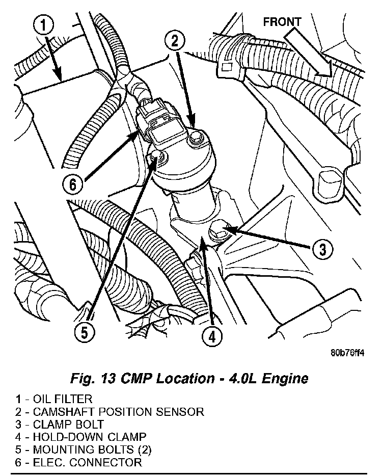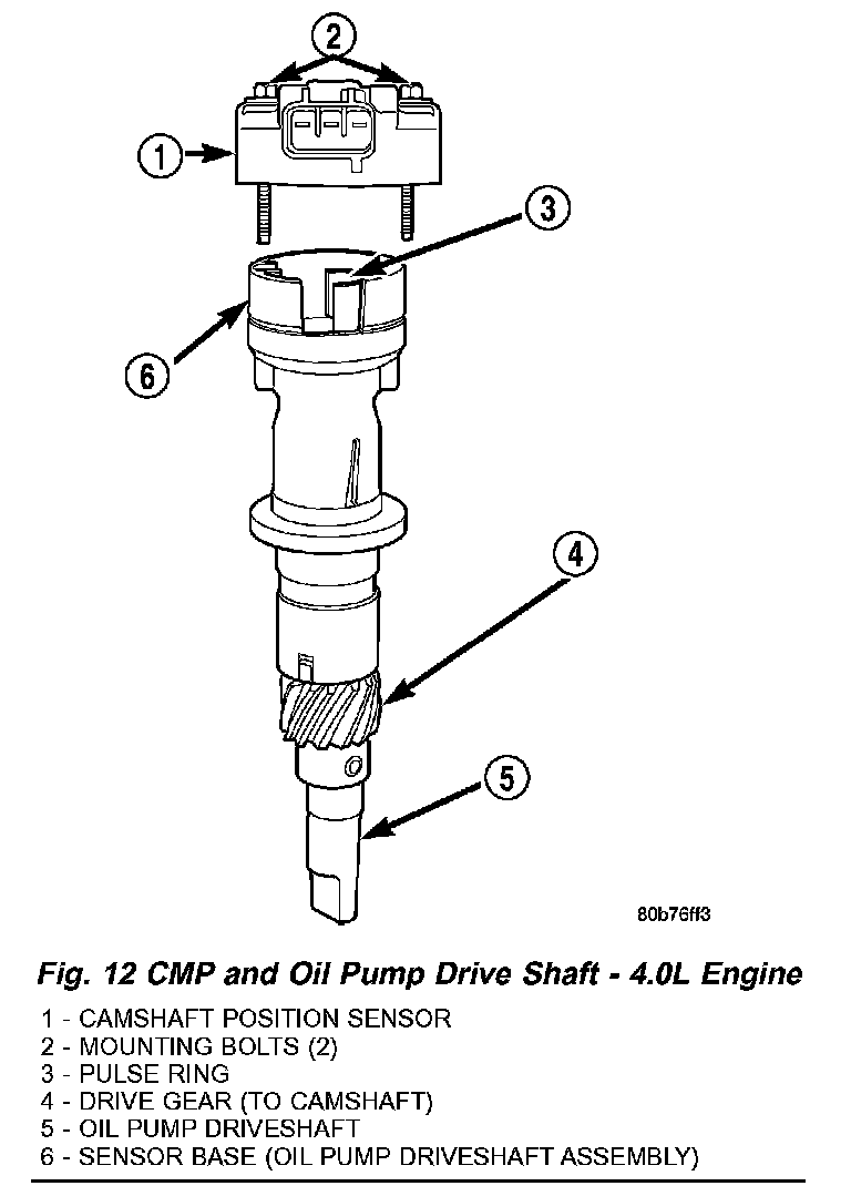 The Camshaft Position Sensor (CMP) on the 4.0L 6-cylinder engine is bolted to the top of the oil pump drive shaft assembly. The sensor and drive shaft assembly is located on the right side of the engine near the oil filter.