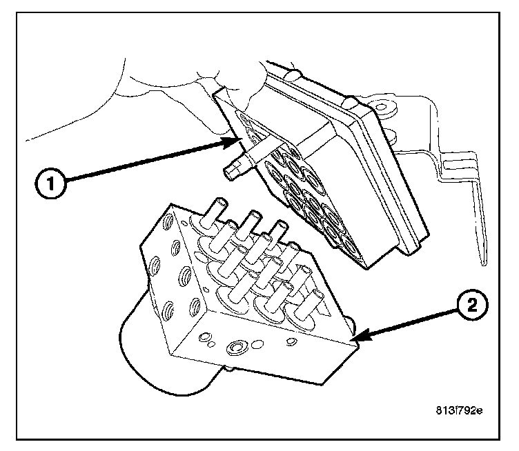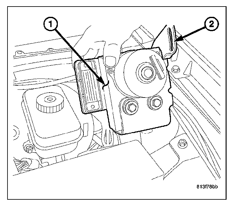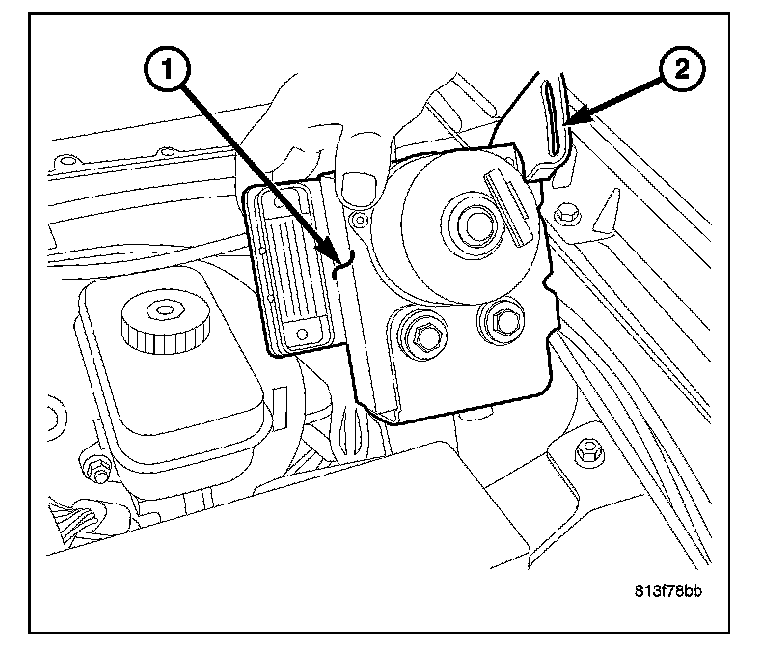 2. Install the 3 ABM (1) mounting bolts to the HCU (2) if removed tighten mounting bolts to 12 Nm (9 ft. lbs.).