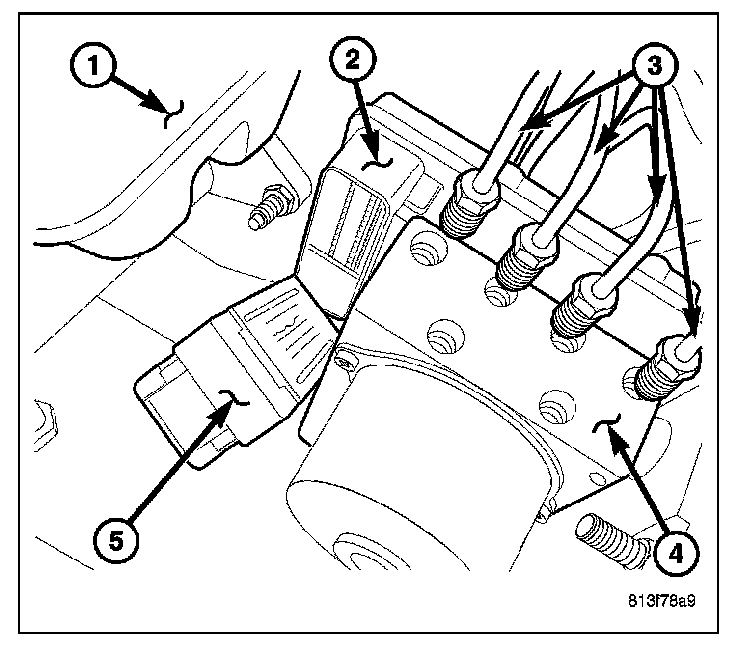 9. Remove the 4 chassis lines (3) at the HCU (4).