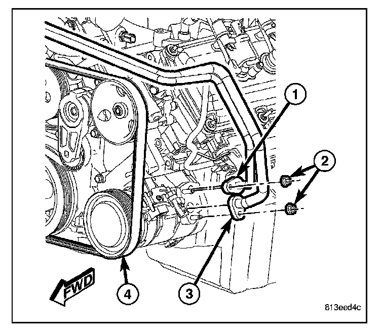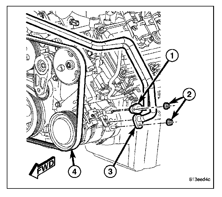 8. Install the A/C suction line (3) and the A/C discharge line (1) onto the A/C compressor (4).