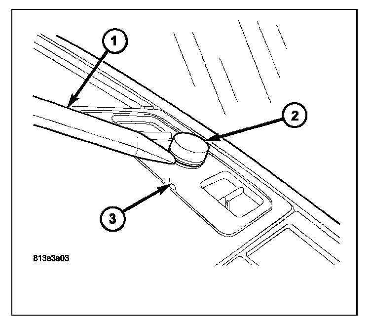 2. Using a trim stick or another suitable wide flat-blade tool (1), gently pry between both sides of the sun sensor (2) and the instrument panel (3) to release the snap clip retainers located at the front of the sensor near the windshield.