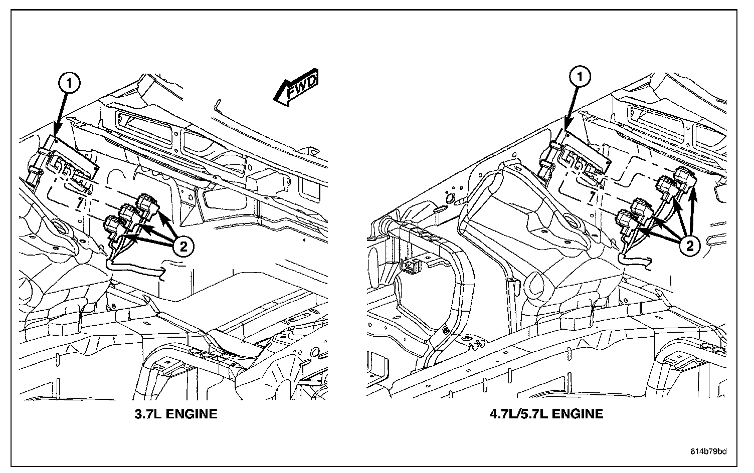 The PCM (1) is attached to the right-front inner fender located in the engine compartment.