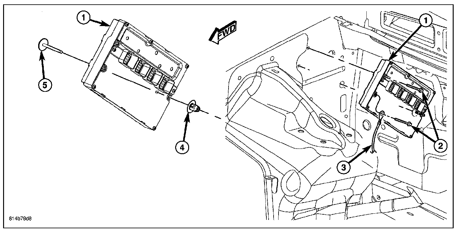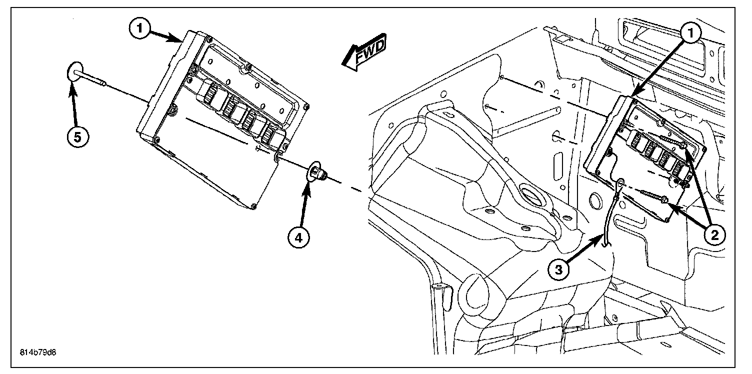 3. A locating pin (5) is used in place of one of the PCM mounting bolts. Pry clip (4) from pin (5).