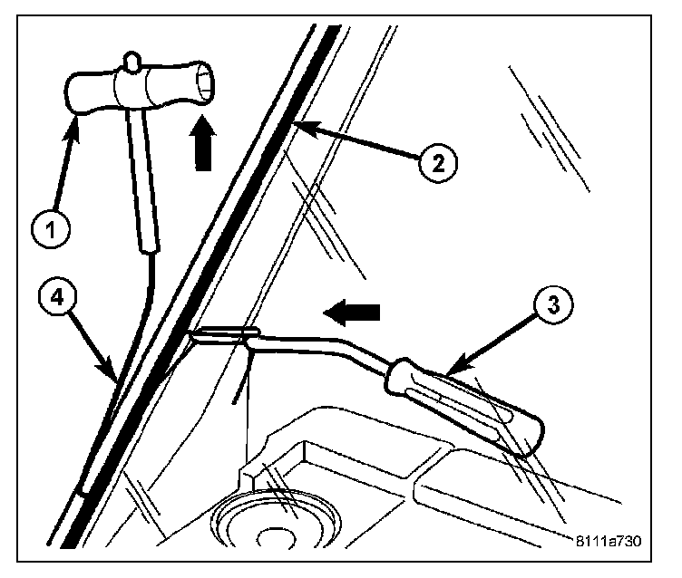 6. Using an assistant and a wire-type windshield cutout tool (1, 3 and 4), cut and separate the urethane adhesive (2) securing the windshield to the windshield fence.
