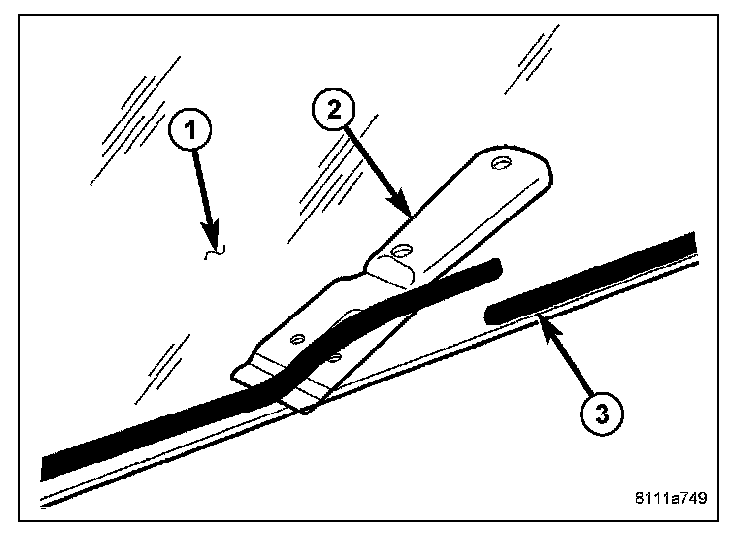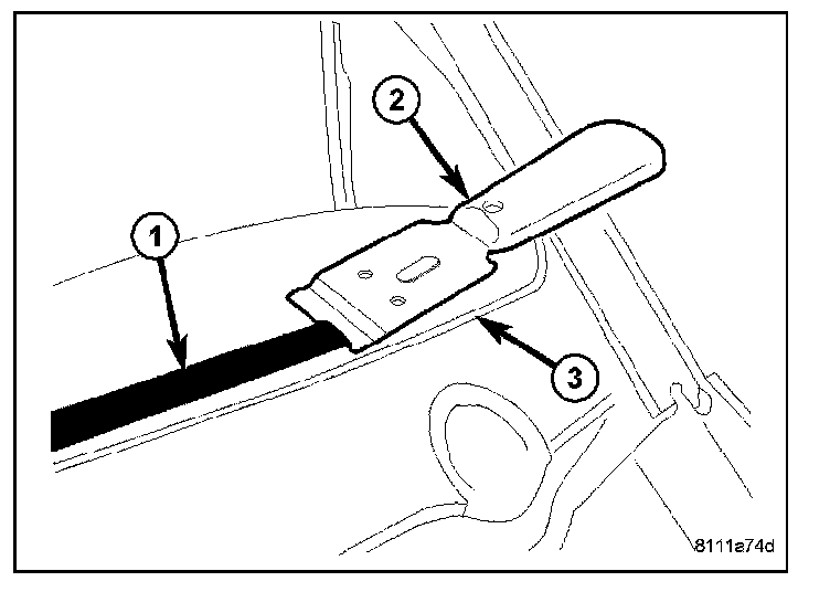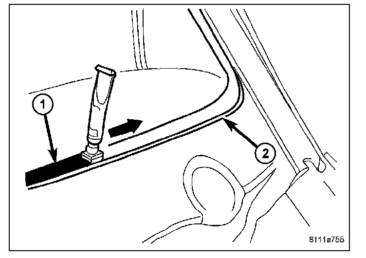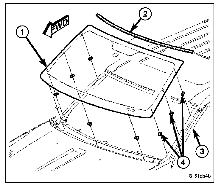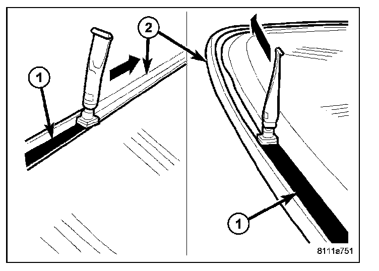 4. Install a new rubber seal (2) along the top of the windshield (1).