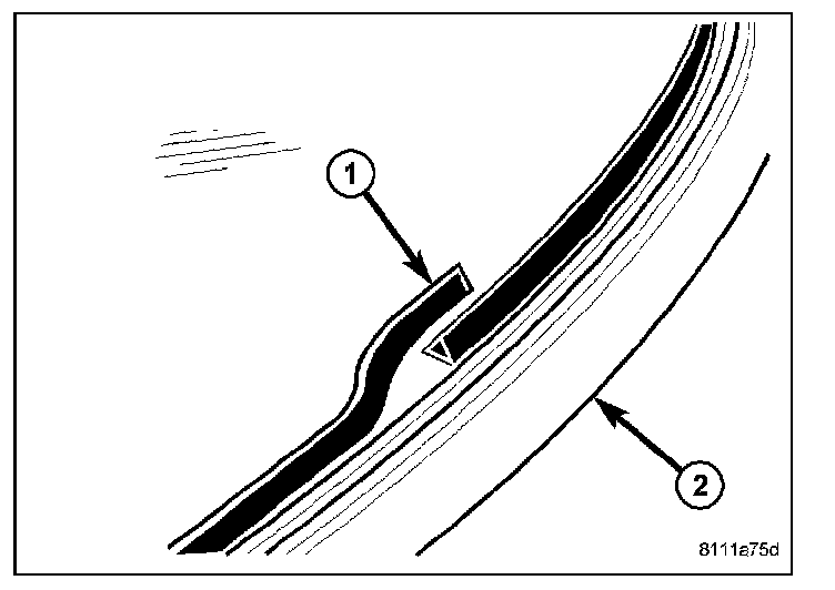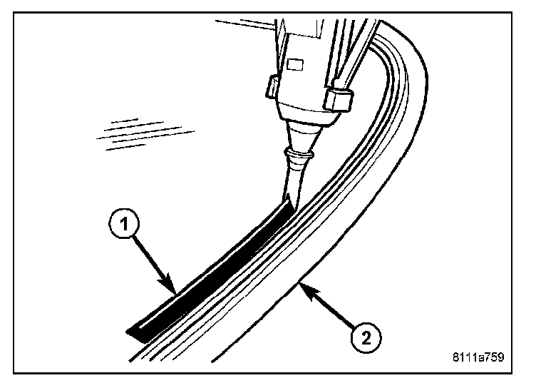18. Apply approximately a 10 mm (0.4 in.) wide bead of adhesive (1) with a triangular nozzle approximately 6 mm (0.230 in.) from the edge of the glass (2) starting at the bottom center of the windshield.