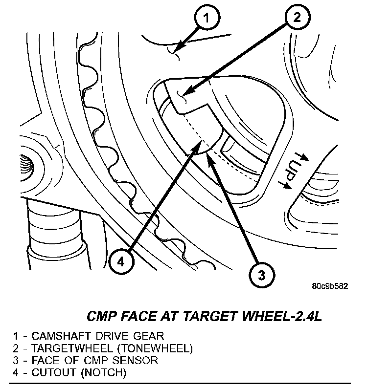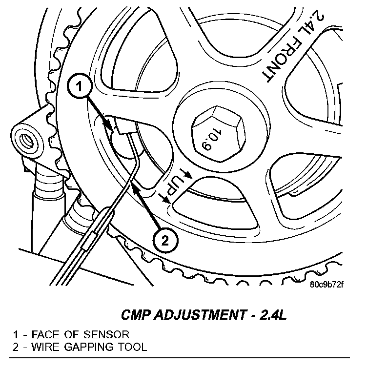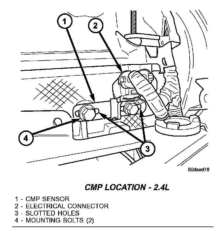 The Camshaft Position Sensor (CMP) on the 2.4L 4-cylinder engine is bolted to the right-front side of the cylinder head. Sensor position (depth) is adjustable.