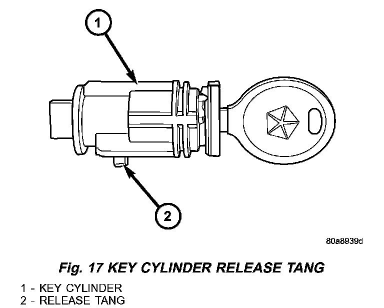 1. Install the key cylinder (1) into the housing using care to align the end of the key cylinder with the ignition switch (Fig. 17).