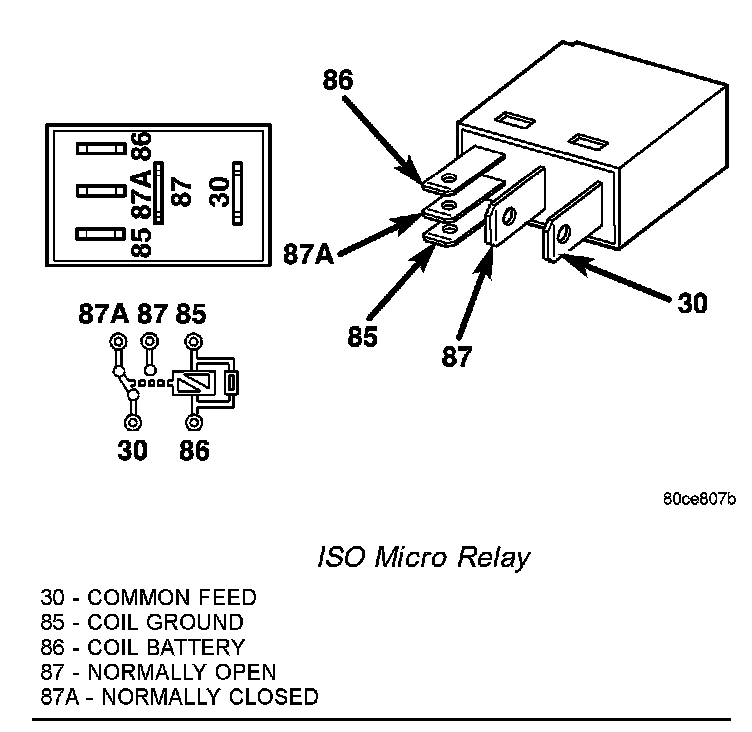 2. A relay in the de-energized position should have continuity between terminals 87 A and 30, and no continuity between terminals 87 and 30. If OK, go to Step 3. If not OK, replace the faulty relay.
