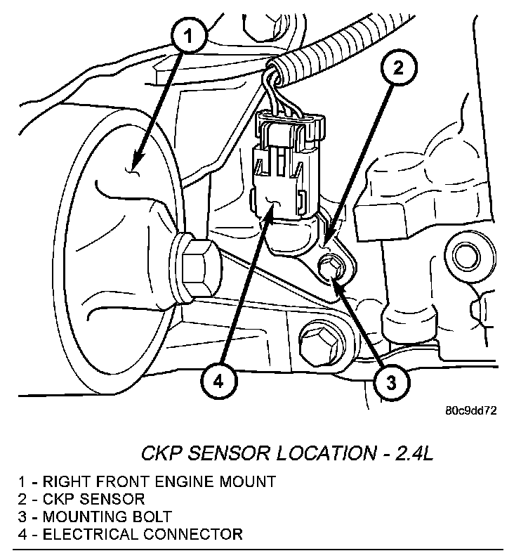 The Crankshaft Position (CKP) sensor is mounted into the right front side of the cylinder block. It is positioned and bolted into a machined hole.
