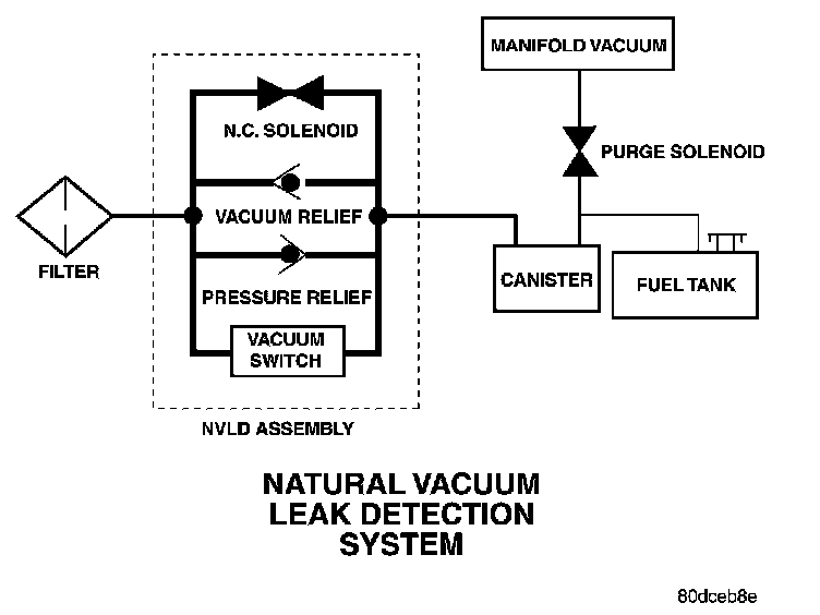 The Natural Vacuum Leak Detection (NVLD) system is the next generation evaporative leak detection system that will first be used on vehicles equipped with the Powertrain Control Module (PCM) or Next Generation Controller (NGC) starting in 2002 M.Y. This new system replaces the leak detection pump as the method of evaporative system leak detection. The current CARB requirement is to detect a leak equivalent to a 0.0209 (0.5 mm) hole. This system has the capability to detect holes of this size very dependably.