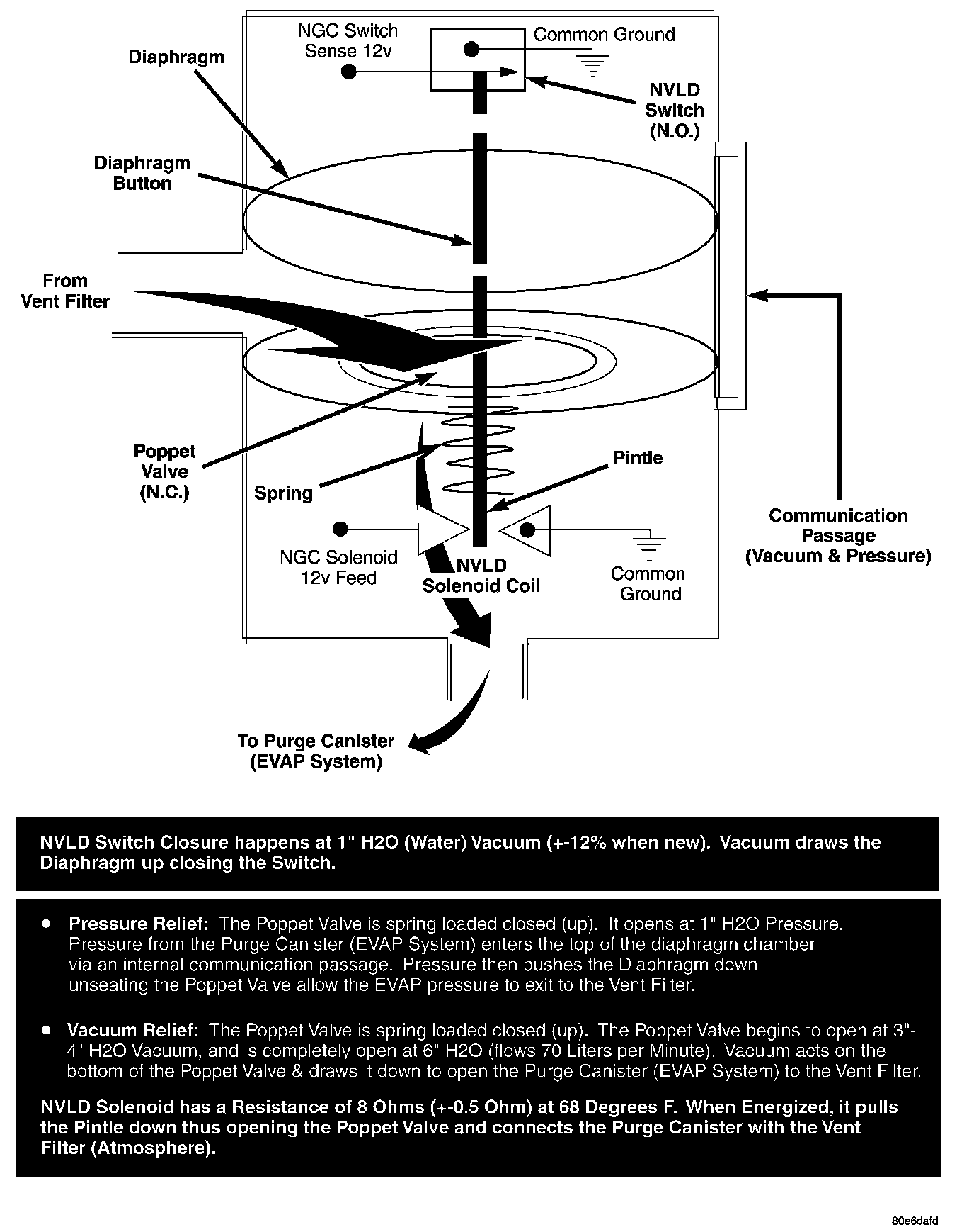 The normally closed valve in the NVLD is intended to maintain the seal on the evaporative system during the engine off condition. If vacuum in the evaporative system exceeds 39 to 69 H2O (0.75 to 1.5 KPA), the valve will be pulled off the seat, opening the seal. This will protect the system from excessive vacuum as well as allowing sufficient purge flow in the event that the solenoid was to become inoperative. The solenoid actuates the valve to unseal the canister vent while the engine is running. It also will be used to close the vent during the medium and large leak tests and during the purge flow check. This solenoid requires initial 1.5 amps of current to pull the valve open but after 100 ms. will be duty cycled down to an average of about 150 mA for the remainder of the drive cycle.