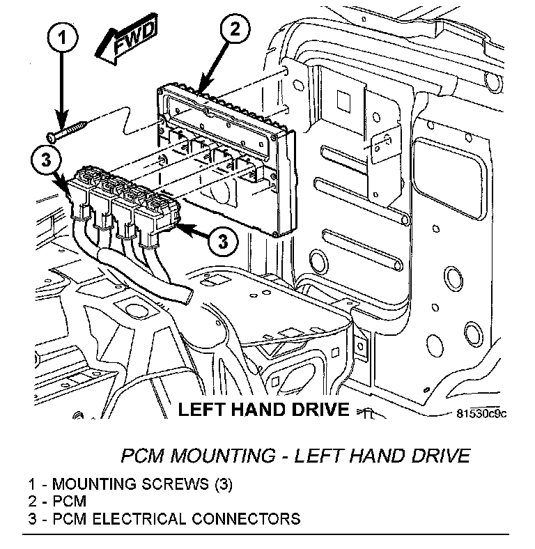 The PCM (1) or (2) is located in the engine compartment. The PCM is referred to as the NGC.