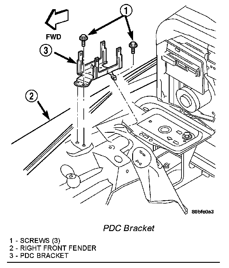 2. Install and tighten the three screws that secure the PDC mounting bracket to the right front inner fender. Tighten the screws to 3.9 N-m (35 in. lbs.).