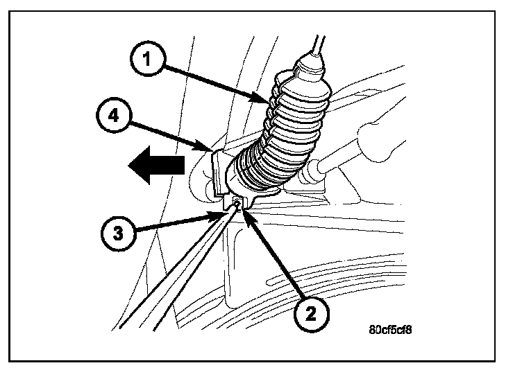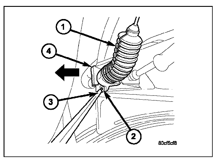 4. Using a pick or small screwdriver, press release tab (2) to release plastic cable mount from bracket. Press on tab only enough to release cable from bracket. If tab is pressed too much, it will be broken. Slide plastic mount (4) towards right side of vehicle to remove throttle cable from throttle body bracket.