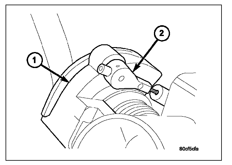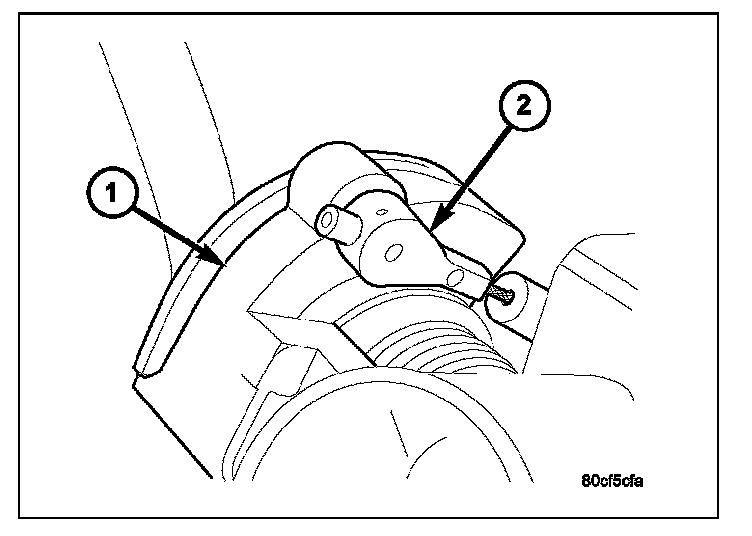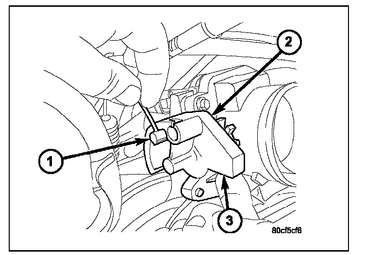 5. Using finger pressure only, disconnect servo cable connector (2) at throttle body bellcrank pin by pushing connector off bellcrank pin towards front of vehicle. DO NOT try to pull connector off perpendicular to the bellcrank pin. Connector will be broken.
