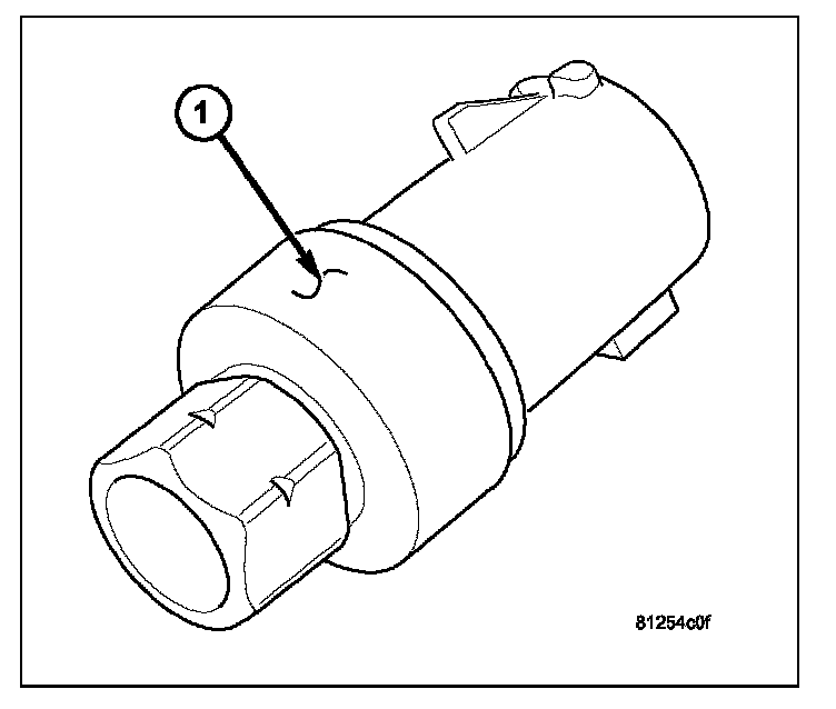The A/C pressure transducer (1) is a switch that is installed on a fitting located on the A/C discharge line. An internally threaded fitting on the A/C pressure transducer connect it to the externally threaded Schrader-type fitting on the A/C discharge line. A rubber O-ring seals the connection between the A/C pressure transducer and the discharge line fitting. The A/C pressure transducer is connected to the vehicle electrical system by a molded plastic connector with three terminals.