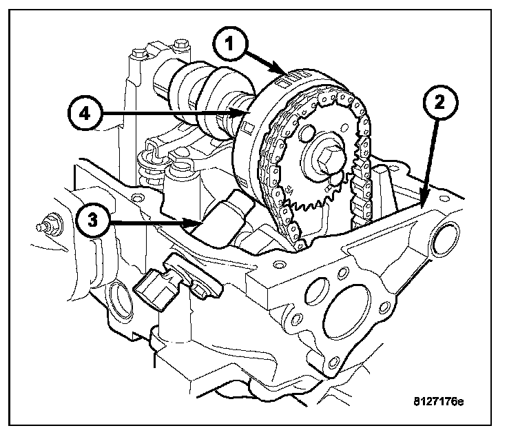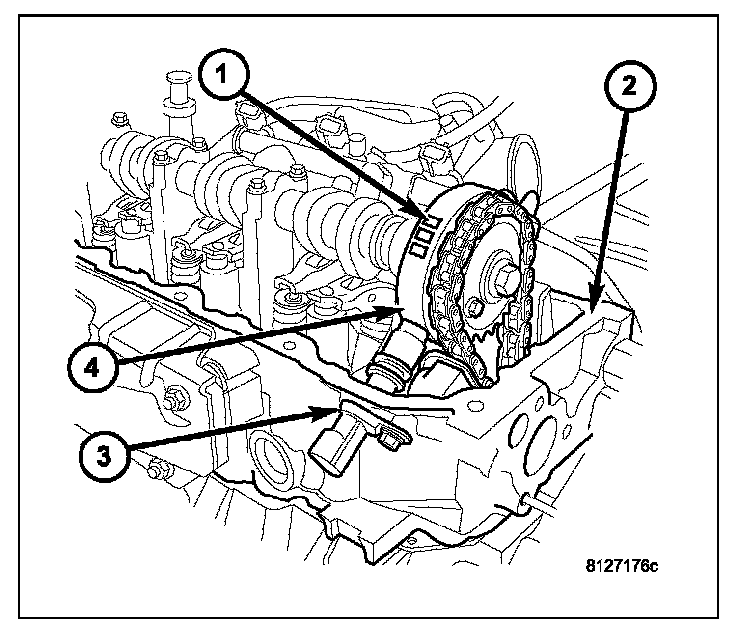 The Camshaft Position Sensor (CMP) sensor on the 3.7L (3) contains a hall effect device referred to as a sync signal generator. A rotating target wheel (tonewheel) (4) for the CMP is located at the front of the camshaft for the right cylinder head (2). This sync signal generator detects notches (1) located on a tonewheel. As the tonewheel rotates, the notches pass through the sync signal generator. The signal from the CMP sensor is used in conjunction with the Crankshaft Position Sensor (CKP) to differentiate between fuel injection and spark events. It is also used to synchronize the fuel injectors with their respective cylinders.