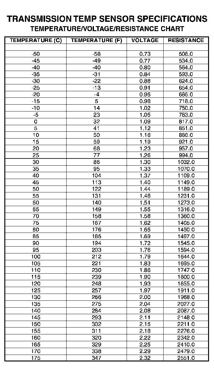 Refer to the Transmission Temperature Sensor Specifications table for the relationship between transmission temperature, sensor voltage, and sensor resistance.