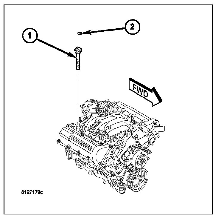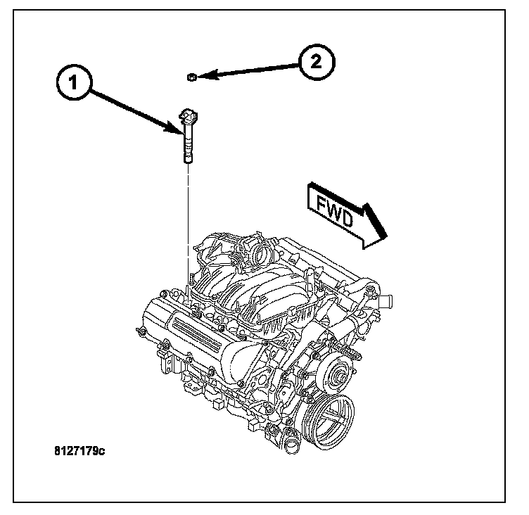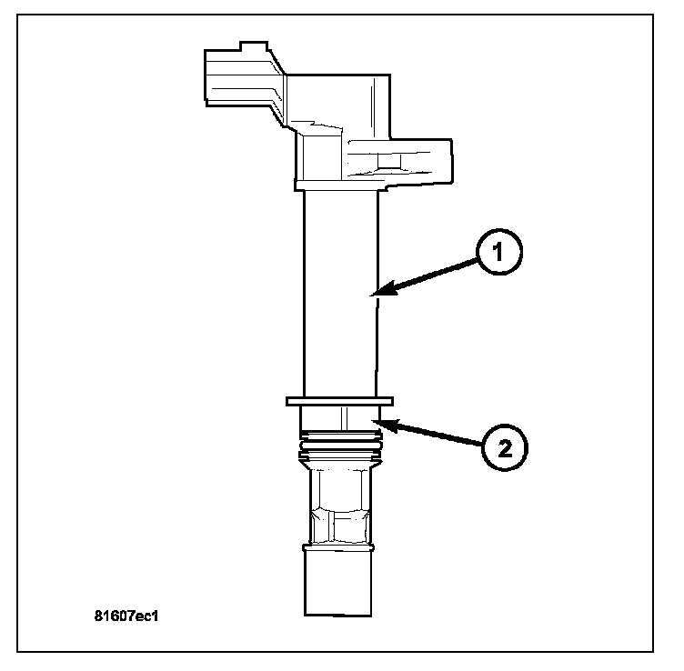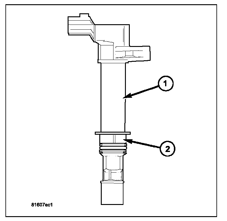 An individual ignition coil (1) is used for each spark plug. The coil fits into machined holes in the cylinder head. A mounting stud/nut secures each coil to the top of the intake manifold. The bottom of the coil is equipped with a rubber boot to seal the spark plug to the coil. Inside each rubber boot is a spring. The spring is used for a mechanical contact between the coil and the top of the spark plug. These rubber boots and springs are a permanent part of the coil and are not serviced separately. An O-ring (2) is used to seal the coil at the opening into the cylinder head.
