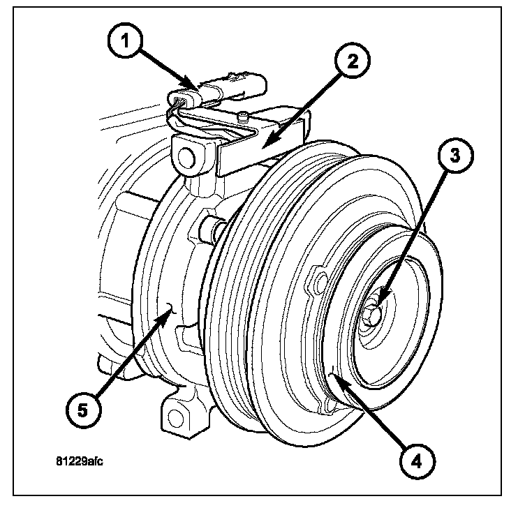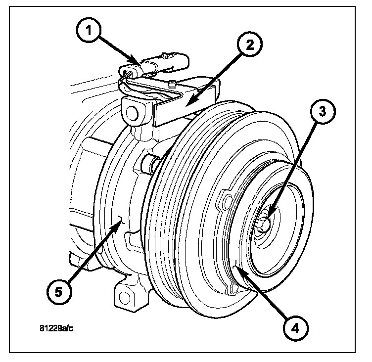 6. Install the clutch plate (4) onto the front of the A/C compressor (5).