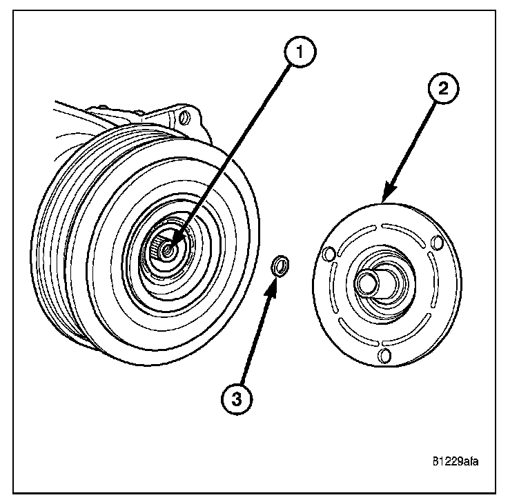 5. If the original clutch plate (2) and pulley and bearing assembly are to be reused, reinstall the original shim(s) (3) onto the compressor shaft (1). If a new clutch plate and pulley and bearing assembly are being used, install a trial stack of shims 2.54 mm (0.010 in.) thick onto the compressor shaft.