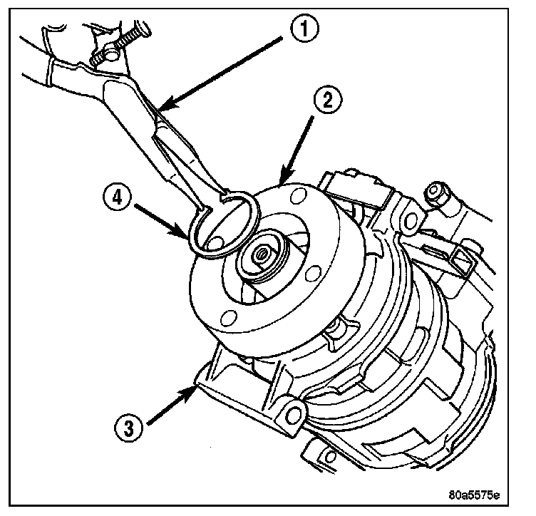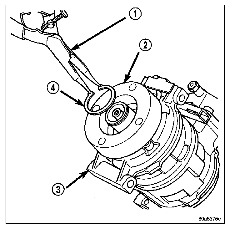 2. Using snap ring pliers (Special Tool C-4574 or equivalent) (1), install the snap ring (4) that secures the compressor clutch field coil to the front of the A/C compressor. Be certain that the snap ring is fully and properly seated in the groove and oriented correctly.