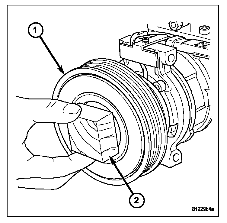 3. Install the pulley and bearing assembly (1) onto the front of the A/C compressor. If necessary, tap the pulley gently with a block of wood (2) placed on the pulley friction surface.