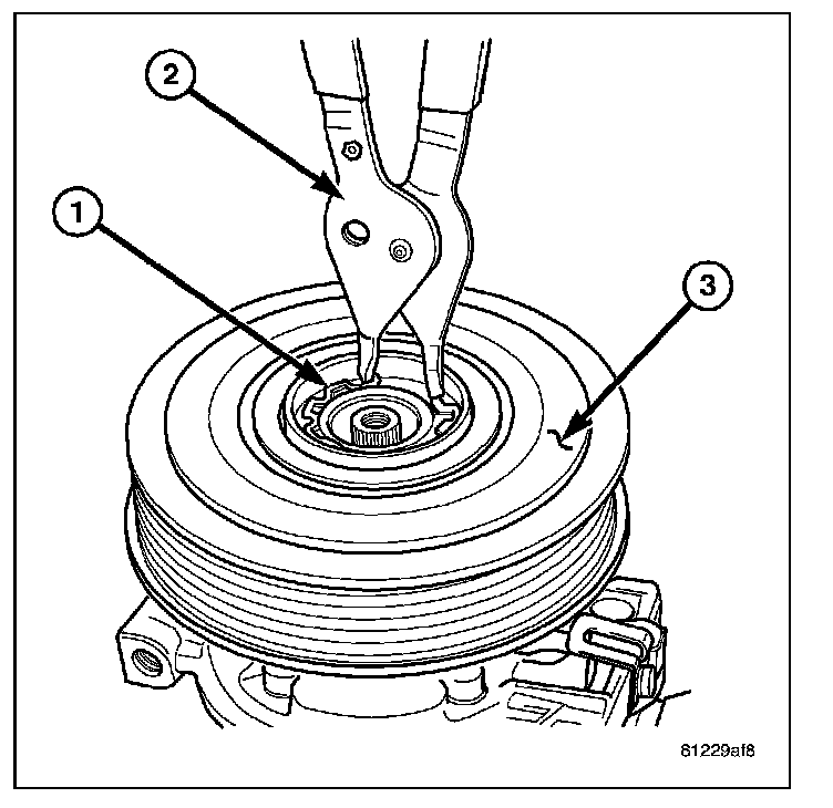 4. Using snap ring pliers (2), install the snap ring (1) that secures the pulley and bearing assembly (3) to the front of the A/C compressor. Be certain that the snap ring is fully and properly seated in the groove.