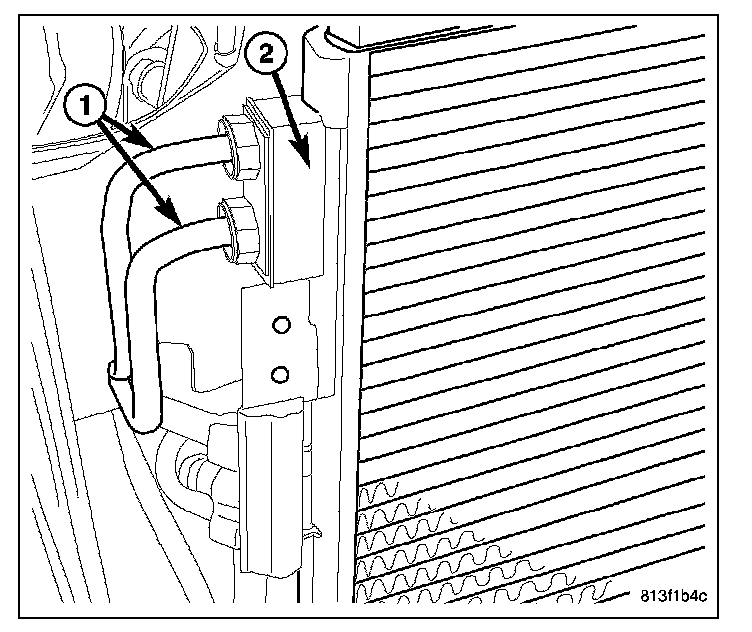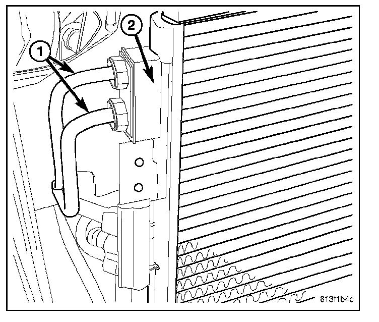 7. Connect the automatic transmission cooler lines (1) to the transmission fluid cooler (2).