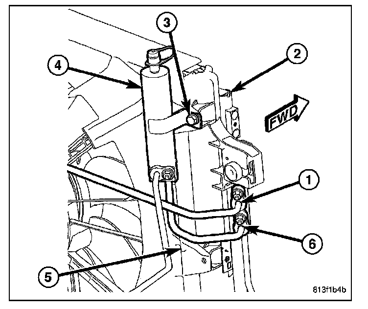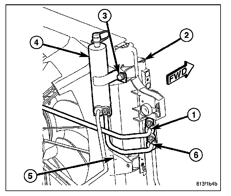 10. Loosen the screw (3) that secures the receiver/ drier (4) to the radiator and fan shroud (5).