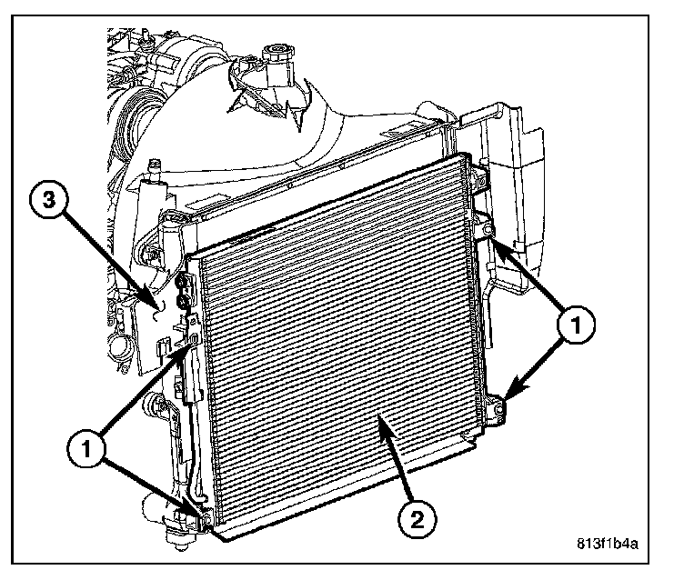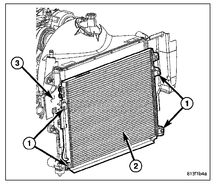 1. Carefully position the A/C condenser (2) onto the radiator (3).