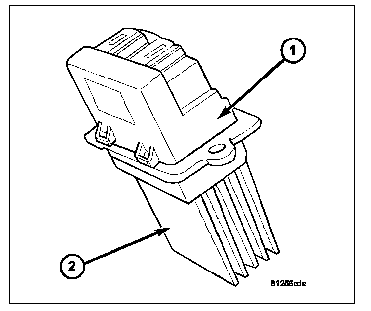 The blower motor power module is mounted to the rear of the HVAC housing, directly behind the glove box. The blower motor power module consists of a molded plastic mounting plate with two integral connector receptacles (1). Concealed behind the mounting plate is the power module electronic circuitry and a large finned heat sink (2).