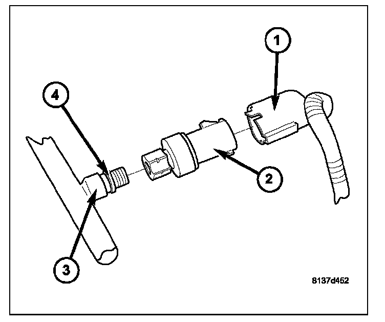 2. Install the A/C pressure transducer (2) onto the A/C discharge line. Tighten the A/C pressure transducer securely.