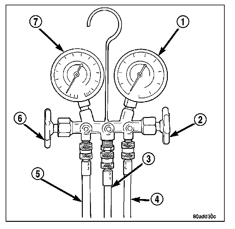 A manifold gauge set (1) may be needed with some recovery/recycling/charging equipment. The manifold gauge set should have manual shut-off valves (2 and 6), or automatic back-flow valves located at the service port connector end of the manifold gauge set hoses (4 and 5). This will prevent refrigerant from being released into the atmosphere.