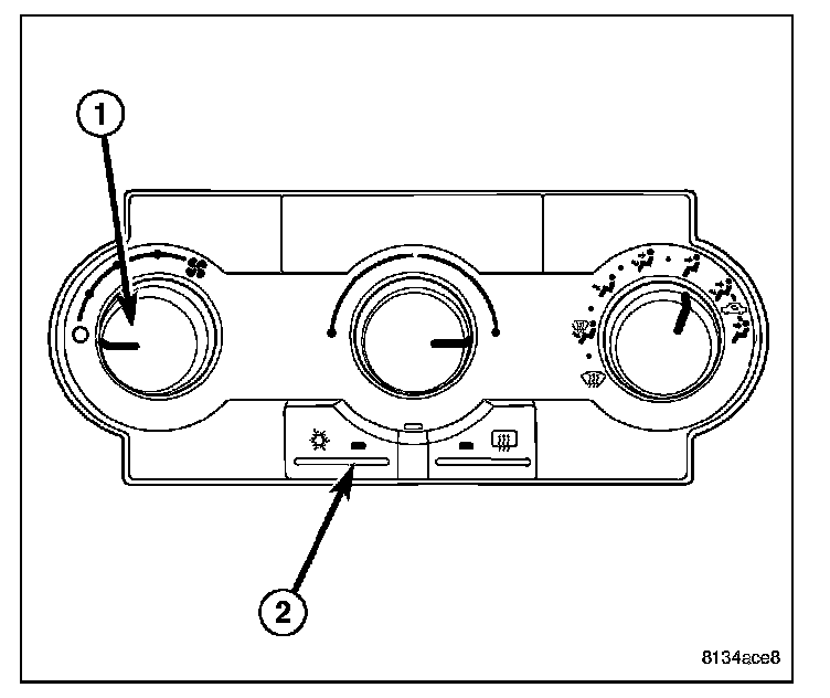 4. Press and hold the A/C mode switch (2) down and then turn the blower motor control to high speed. Continue to hold the A/C mode switch down until the A/C status indicator begins flashing, Then, release the mode switch.