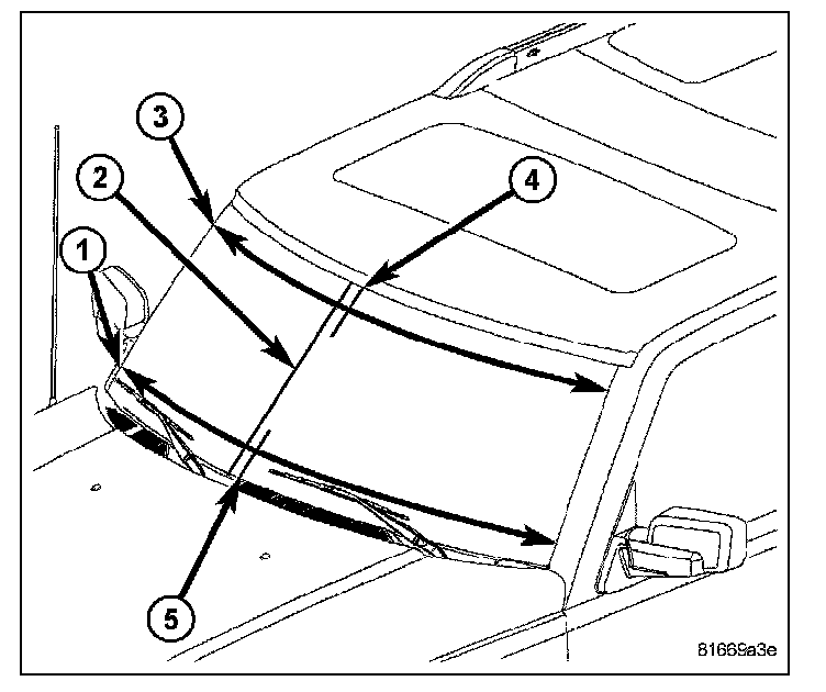 1. Take a measurement (3) across the lower edge of the tint band at the top of the windshield using the shaft of the tint band arrow within the "AS1" marking on each side of the glass as the reference points.