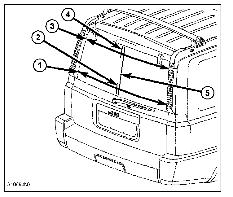 1. Take a measurement (3) across the lower edge of the liftgate glass hinges using the vertical edges of the body liftgate opening as the reference points.