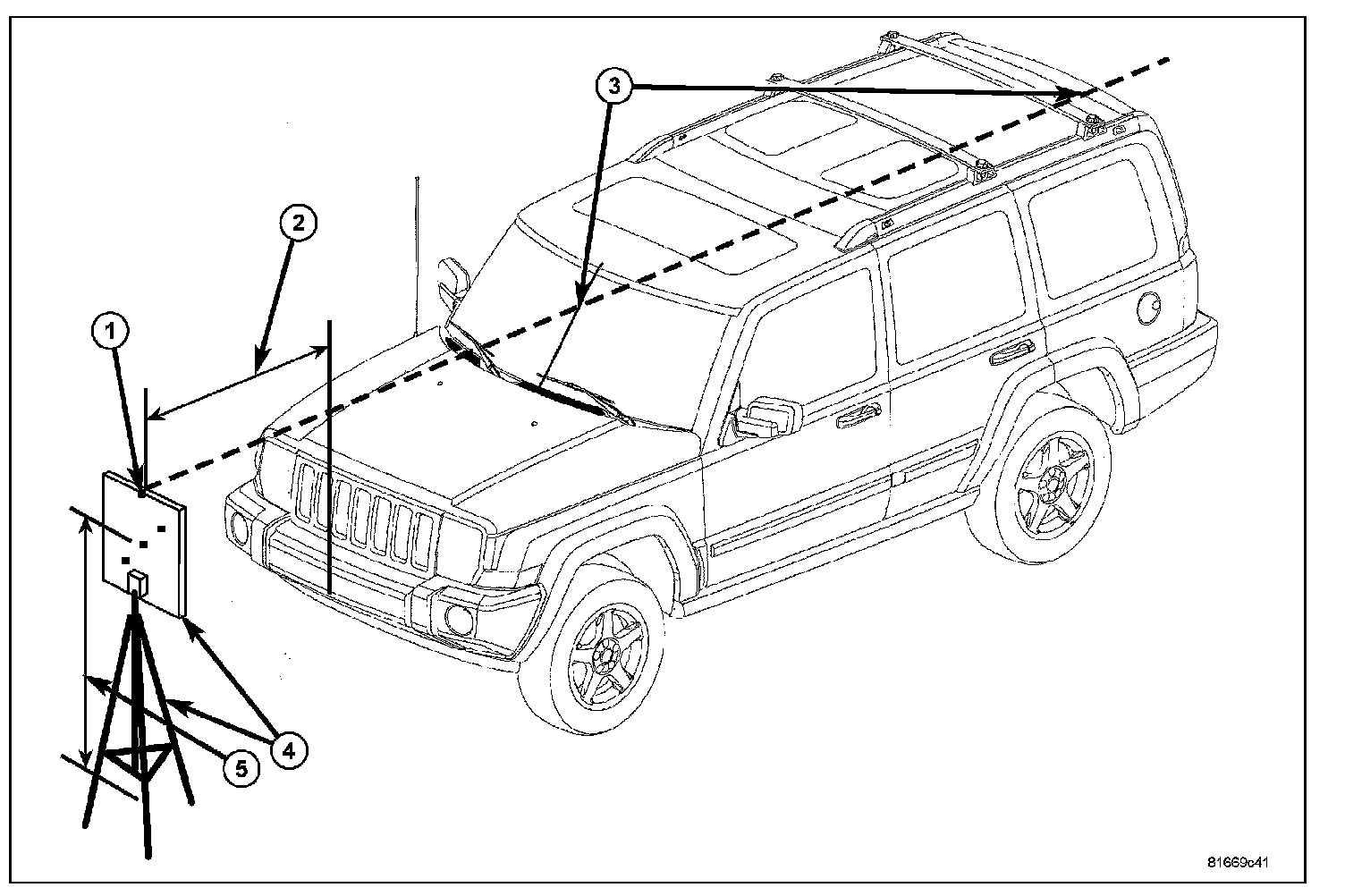 2. Place the aim board and tripod (4) (Special Tool No. 9649) 127 centimeters (50 inches) ahead of the foremost center of the front fascia (2).