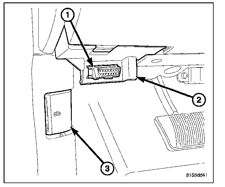 1. Connect a diagnostic scan tool to the Data Link Connector (DLC) (1) below the driver side end of the instrument panel (2).