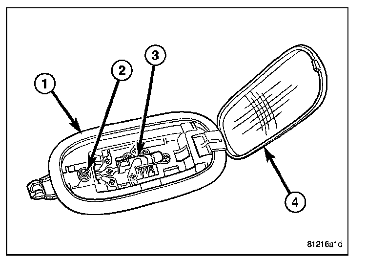 2. Insert the tip of a small flat-bladed screwdriver into the notch on the switch (2) side of the third row reading lamp between the lens (4) and the lamp housing (1).