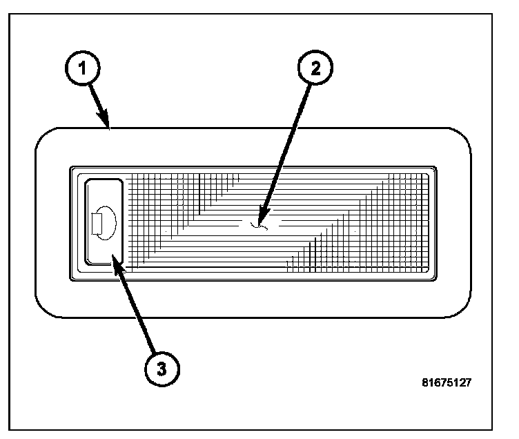 2. Using a small thin-bladed screwdriver, gently pry the switch end of the reading lamp lens (2) away from the lamp housing (1) far enough to unsnap the switch end of the lens from the housing. The switch end of the lens is identified by a tactile concave depression (3).