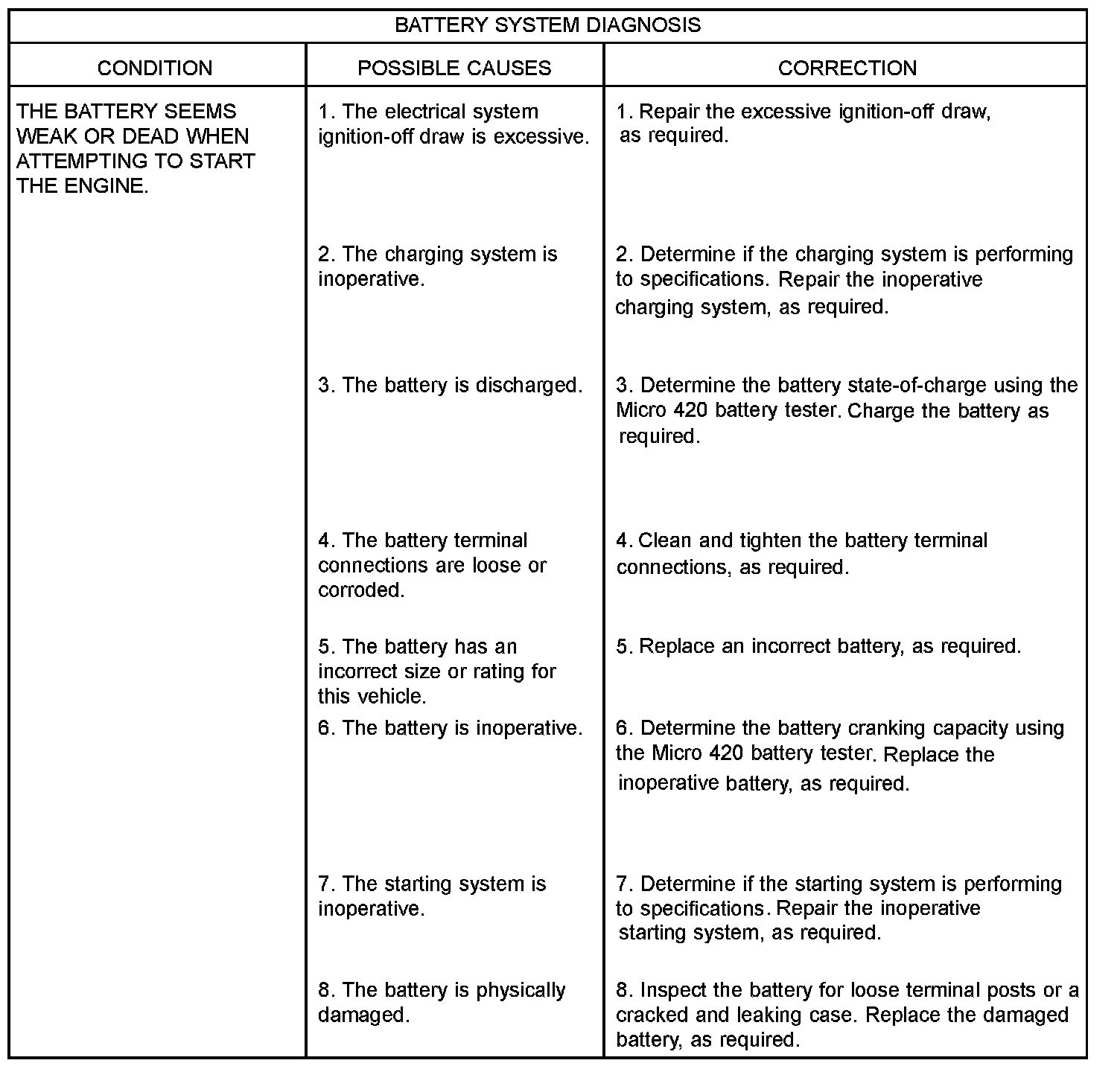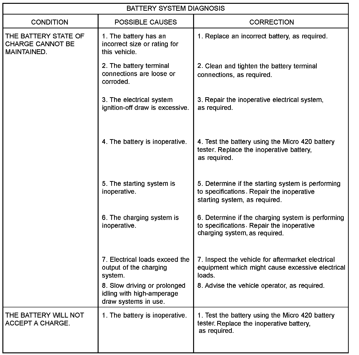 BATTERY SYSTEMThe battery, starting, and charging systems in the vehicle operate with one another and must be tested as a complete system. In order for the engine to start and the battery to maintain its charge properly, all of the components that are used in these systems must perform within specifications. It is important that the battery, starting, and charging systems be thoroughly tested and inspected any time a battery needs to be charged or replaced. The cause of abnormal battery discharge, overcharging or early battery failure must be diagnosed and corrected before a battery is replaced and before a vehicle is returned to service. However, when attempting to diagnose any of these systems, it is important that you keep their interdependency in mind.