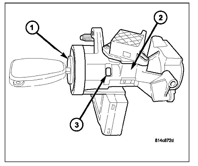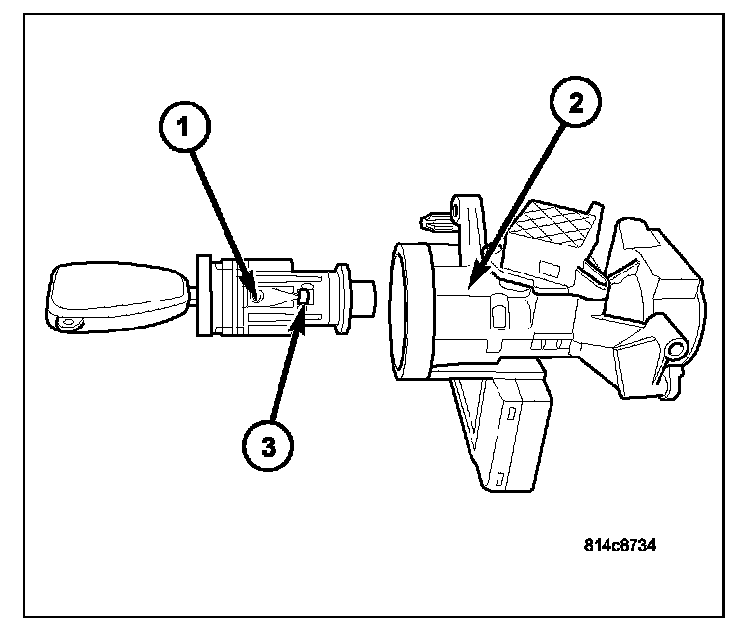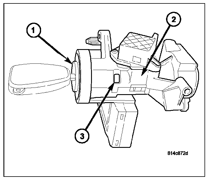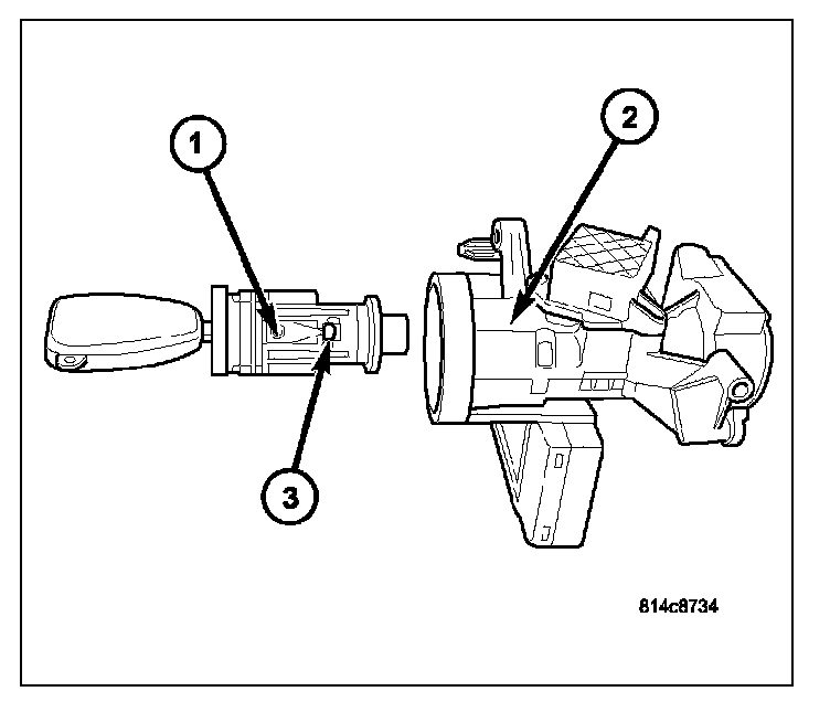 3. To remove key lock cylinder (1) from housing (2), rotate key to ON position while pressing on release tab (3). This tab (3) is located on the right side of the switch assembly.