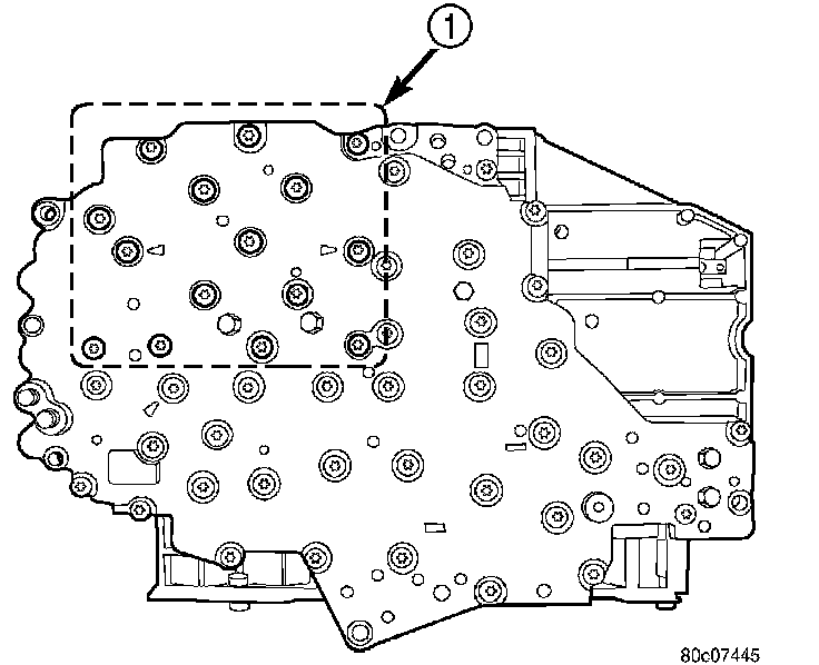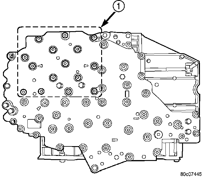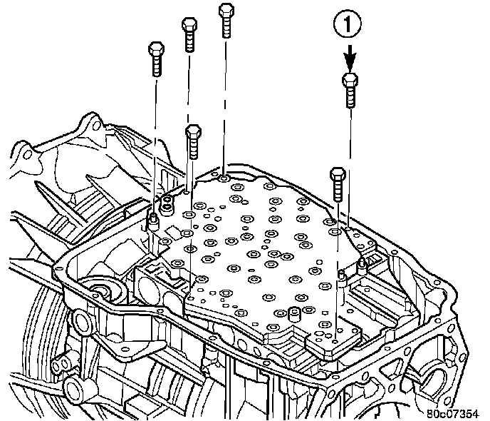 2. Remove the bolts (1) holding the transmission solenoid/TRS assembly onto the valve body