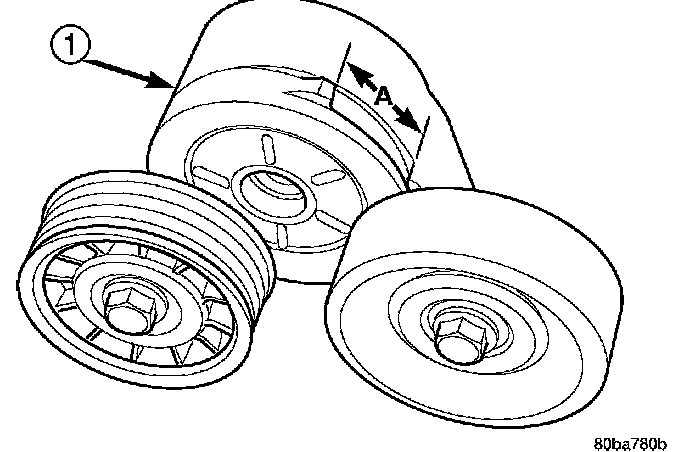 3. With the drive belt installed, inspect the belt wear indicator. On 4.7L Engines the gap between the tang and the housing stop (measurement A) must not exceed 24 mm (.94 inches).